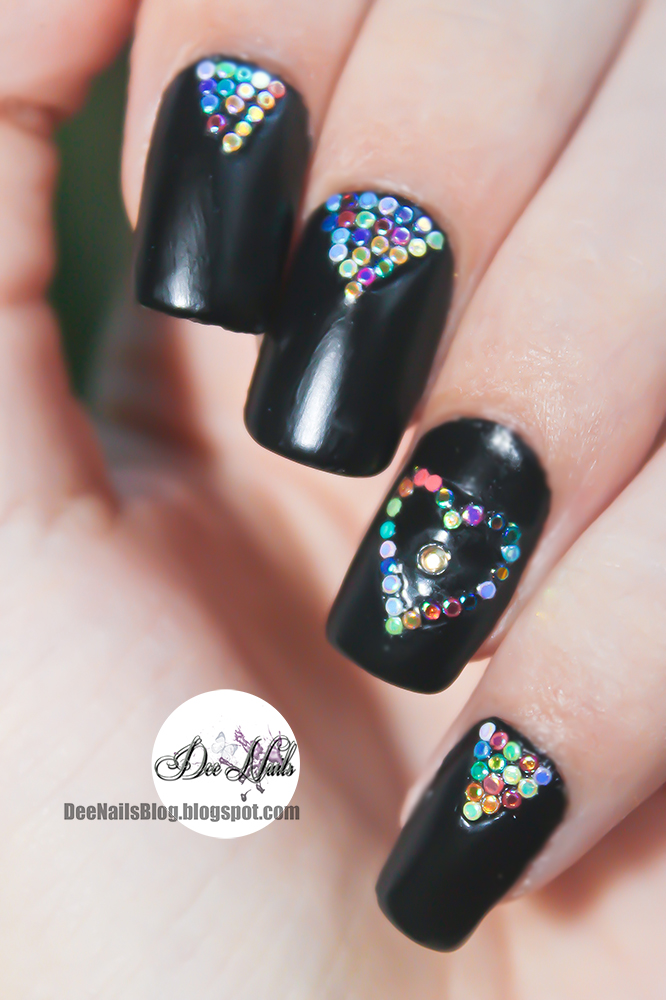 On the accent nail I set them in a heart shape using random colors and in the middle I have 1 rhinestone from the previously reviewed mix of rhinestones that you can find >here<
